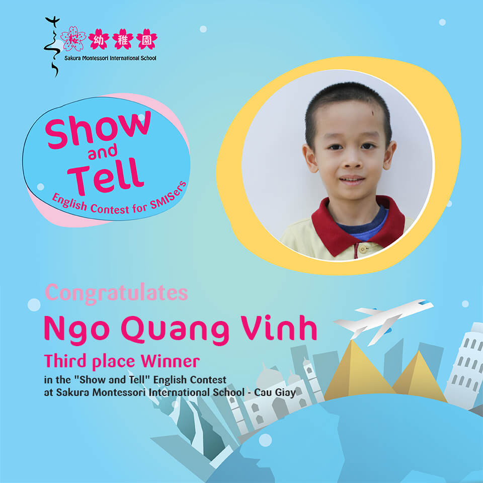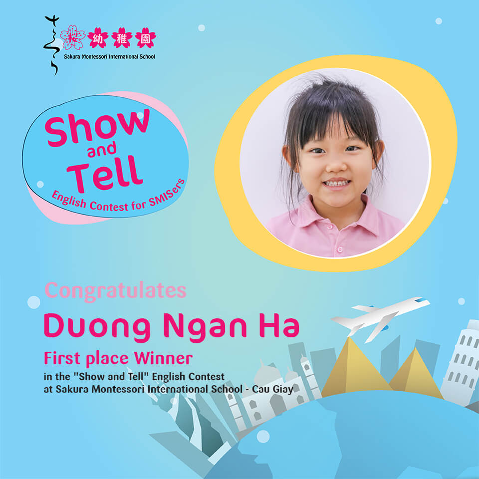 5 giải Nhất, 7 giải Nhì và 6 giải Ba của Cuộc thi Tiếng Anh “Show and Tell” đã thuộc về 17 bạn nhỏ xuất sắc đến từ các các cơ sở Sakura Montessori Cầu Giấy, Lương Yên, Thụy Khuê, Hà Đông, Hải Phòng, Hạ Long và Hồ Chí Minh.