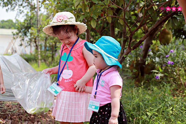 Honey nắm tay chị như này nhé! Nắm chặt vào kẻo lạc! Xong mình đi hái rau để tối về mẹ nấu canh!