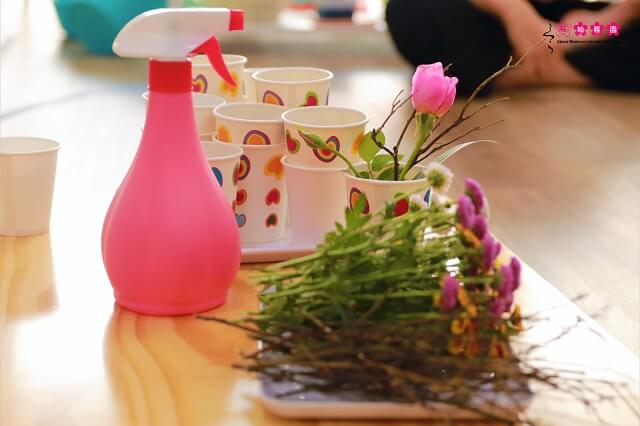 Với mục tiêu giúp các con hiểu được dễ dàng nhất về nghệ thuật Ikebana cơ bản, cô Nụ đã hướng dẫn các con sử dụng cành khô, lá và hoa với cách cắm hài hòa sẽ tượng trưng cho các yếu tố “thiên – địa – nhân” trong văn hóa Nhật Bản. Những nghệ nhân “nhí” của lớp Violet và Lily đều hào hứng chờ cô phát nguyên vật liệu để bắt tay thực hiện lọ hoa nhỏ của mình.