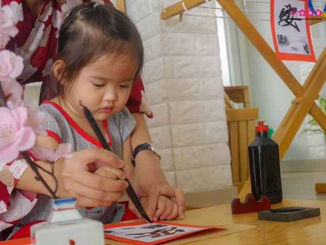 “Đây là thỏi mực, cọ viết, nghiên mực, bút lông. Hôm nay cô và các con sẽ cùng nhau trải nghiệm nghệ thuật thư pháp. Chữ hôm nay chúng mình sẽ viết là chữ An trong từ bình an.” – Cô Phạm Thúy Vy – Giáo viên Văn hóa Nhật tại trường mầm non Sakura Hồ Chí Minh mở đầu bài học Nghệ thuật thư pháp sáng 03/01/2020 tại lớp Parrot.