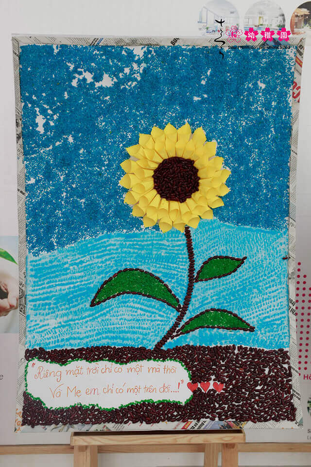 Không kém phần cầu kỳ và đặc sắc là bức tranh “Hoa hướng dương” của lớp Carnation. Sử dụng nguyên liệu độc đáo là gạo và hạt đỗ, với lời nhắn nhủ đầy ý nghĩa: “Riêng mặt trời chỉ có một mà thôi. Và Mẹ em chỉ có một trên đời”, bức tranh là món quà tuyệt vời nhất mà các con dành tặng mẹ.