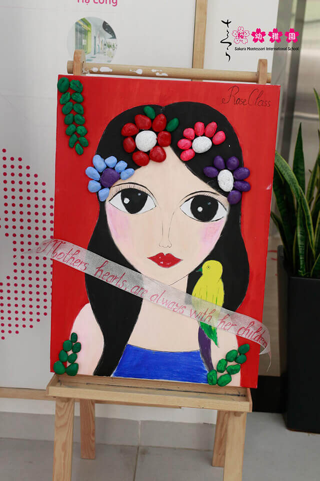 Cũng thể hiện vẻ đẹp của người phụ nữ, cô và các bạn nhỏ lớp Rose lại đem đến triển lãm một bức tranh độc đáo với những bông hoa được tạo nên từ những viên sỏi sắc màu.