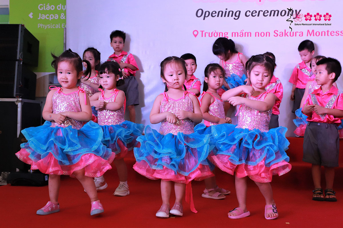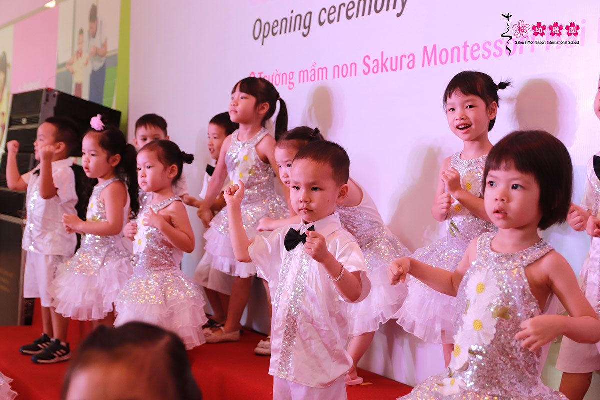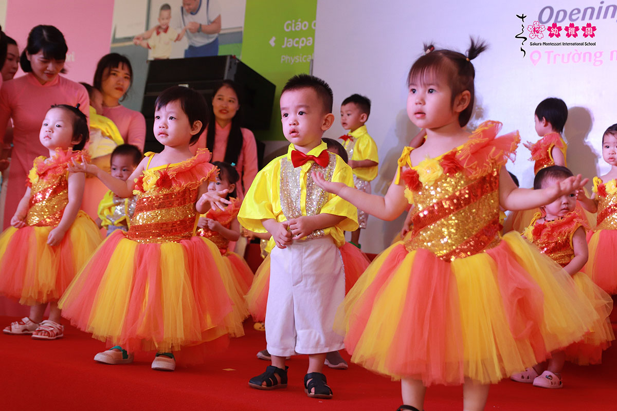 Những “vũ công” nhí ngộ nghĩnh của Sakura Montessori Hai Bà Trưng khoe tài năng nhảy hiện đại với tiết mục “Such a happy day”, “Hello song”, “Những lá thuyền ước mơ”,… Mặc dù còn đôi chút xúc động hay ngơ ngác khi đứng trên sân khấu nhưng các con vẫn cùng nhau lắc lư theo điệu nhạc, đôi tay thi thoảng giơ cao tạo thành động tác, đôi chân bước theo từng nhịp nhạc. Hình ảnh đoàn kết, chủ động và tập trung cao độ cho phần biểu diễn của mình khiến các ba mẹ không khỏi bồi hồi, xúc động. Các con không chỉ khuấy động sân khấu mà còn khiến tất cả thầy cô và ba mẹ đang theo dõi đều phải đứng lên nhún nhảy theo nhạc.