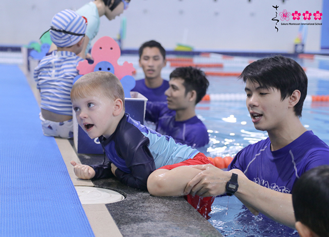 Ba mẹ cũng biết, học bơi giúp các con cải thiện thể lực đồng thời có thêm nhiều kỹ năng phòng chống đuối nước ở trẻ. Bởi vậy, tại trường mầm non Sakura Montessori quân Cầu Giấy, bơi Aqua-Tots là môn không thể thiếu trong các giờ học tại trường.