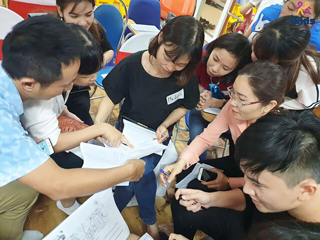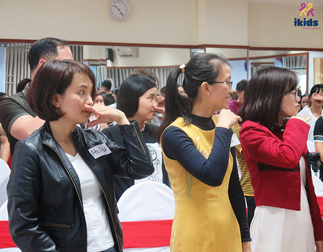 Trong hơn 3 giờ gặp gỡ và tương tác, phụ huynh IKIDS Montessori đã đi qua nhiều trạng thái cảm xúc, từ lắng đọng (trải nghiệm thời thơ ấu xưa cũ: Ngày xưa luôn mong muốn được bố mẹ vỗ về, tôn trọng, yêu thương và lắng nghe) đến bất ngờ (Tất cả các cảm xúc đều cảm thấy hài lòng về những cảm xúc nhưng không phải tất cả các hành vi; Căng thẳng đôi khi cũng hữu ích vì giúp não bộ tập trung, làm tốt hơn…), từ trầm ngâm, giật mình suy nghĩ (Cáu giận, so sánh, trách phạt là sai – Não vui vẻ, học thông minh) đến bật cười vui vẻ (thử thách đưa tay lên cằm hay lên mũi, tìm kiếm đồng tiền nhỏ nhất) v.v…