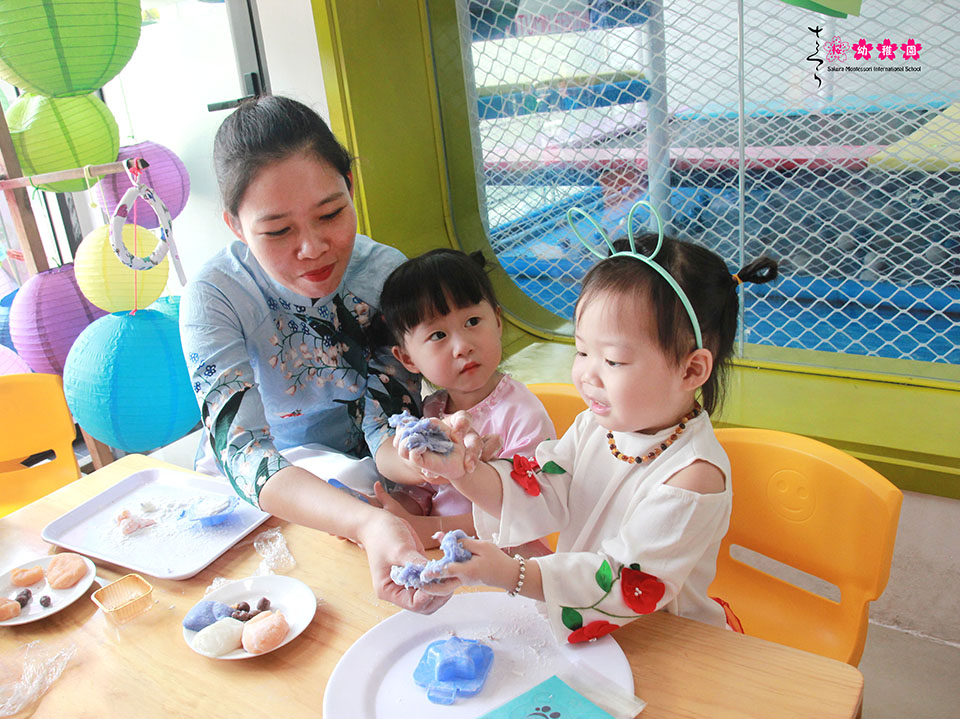 Dưới sự lồng ghép tài tình của các giáo viên Montessori, các con đã có cơ hội tìm hiểu về mâm ngũ quả cũng những đồ vật đặc trưng của Tết Trung Thu như đèn ông sao, trống, mặt nạ…, cùng nhau làm đầu lân đơn giản, vẽ mặt nạ, làm bánh dẻo. Mặc dù những chiếc bánh nhỏ chưa thành hình, những chiếc mặt nạ còn lem nhem màu sắc nhưng chính những hoạt động trong lớp này phần nào bồi đắp cho các con tính kiên nhẫn, phát huy sự sáng tạo, khéo léo và nâng cao tinh thần đoàn kết, gắn bó lẫn nhau.