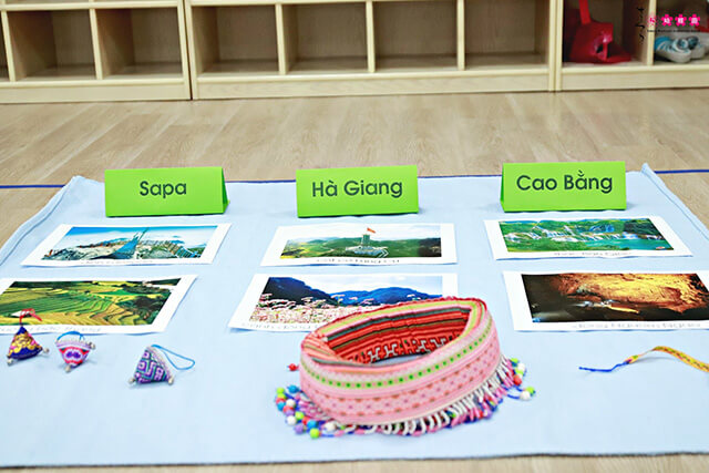 In the Montessori classroom, students are introduced about the tourist destinations in the northern mountainous area with the special images by the teacher. They learn about Sapa which has famous things such as triangle hooks or Ha Gang with beautiful buckwheat flower fields (Tam Giac Mach in Vietnamese), Lung Cu national flag pole and Cao Bang province with Ban Gioc waterfall north west of town and enjoy the fantastic view of rice field near Nguom Ngao Cave. They are really excited to see the famous destinations and confidently share about their favorite places.