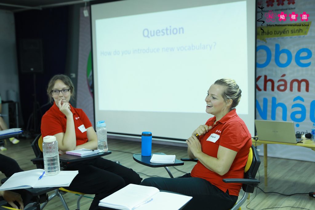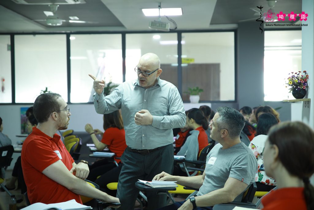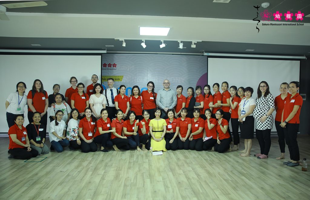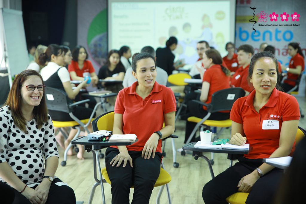 Trong không khí sôi nổi, các giáo viên bản ngữ và trợ giảng tiếng Anh trên toàn hệ thống Trường Mầm non Sakura Montessori đã có những trao đổi tích cực về phương pháp giúp trẻ làm quen với tiếng Anh cùng thầy David Thorpe – Trưởng nhóm chương trình tiếng Anh của nhà trường.