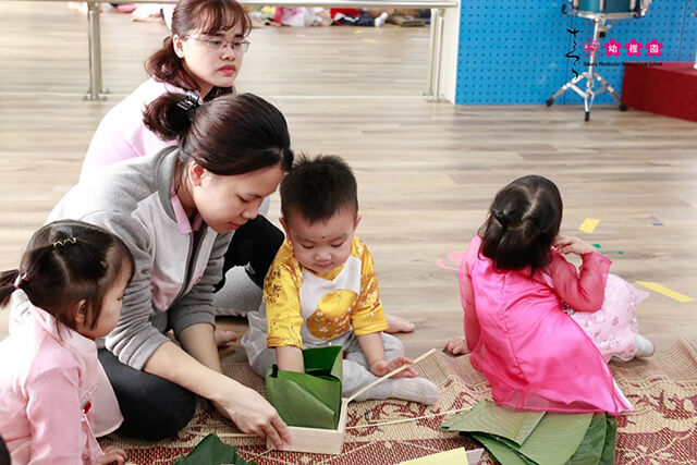 Sau khi lắng nghe vị khách đặc biệt của SMIS Hà Đông giới thiệu các nguyên liệu, các bạn nhỏ cùng cô và ba mẹ bắt tay vào gói bánh chưng.