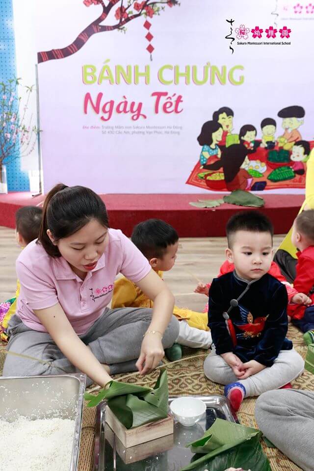 Để gìn giữ nét văn hóa này, vừa qua, Trường mầm non Sakura Montessori Hà Đông đã tổ chức sự kiện “ Bánh chưng ngày Tết”. Trong cái gió lạnh của mùa đông, ngồi quây quần bên nhau gói bánh và trông nồi bánh chưng vẫn luôn là một hình ảnh đẹp mà có lẽ bây giờ ít bạn nhỏ được trải nghiệm.