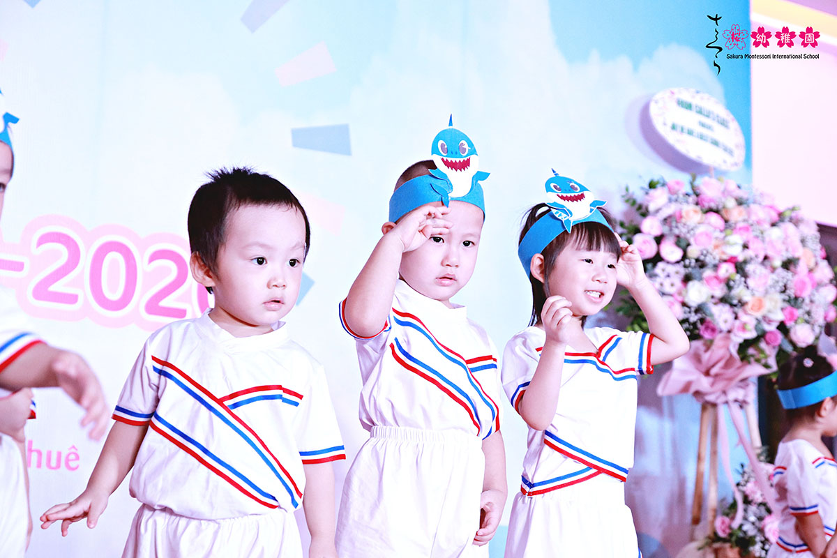 Từ các tiết mục sôi động và đầy hứng khởi “Shalala”, “Action Dance” đến những tiết mục hóa thân vô cùng đặc biệt trong vở kịch “Nhổ củ cải”,… các bạn nhỏ Sakura Montessori Thụy Khuê đã đưa ba mẹ đi từ bất ngờ này đến bất ngờ khác. Đặc biệt nhất không chỉ là những lời ca, tiếng hát ngây thơ, trong sáng mà còn là hình ảnh những chú cá mập tý hon lí lắc trên sân khấu với tiết mục “Baby Shark” và những cô cậu bé tinh nghịch, tràn đầy năng lượng cùng phiên bản vô cùng đặc biệt của “Bắc Kim Thang”, đôi khi lại lắng lại cùng giai điệu trầm lắng, đầy ý nghĩa mang tên “Friends song”.