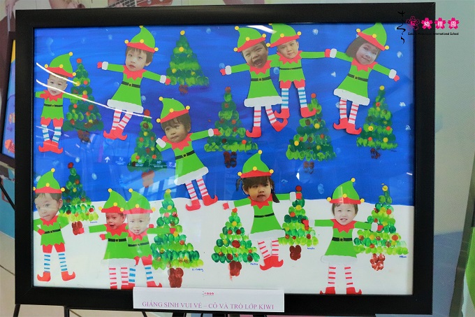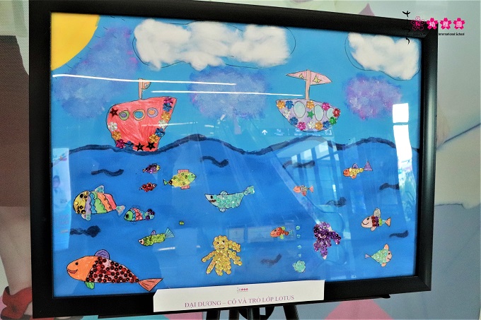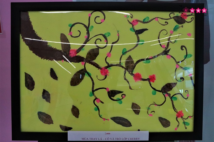 Khác với những bức tranh thông thường sử dụng chất liệu màu vẽ, cọ vẽ đơn thuần, các con đã tạo nên những bức tranh “độc nhất vô nhị” của riêng mình bằng sự sáng tạo và các trải nghiệm từ môi trường học tập của bản thân như: hoa cúc làm cọ, vảy thành chùm pháo hoa, những bức ảnh cá nhân, lá khô thu lượm từ một buổi xuống sân chơi…