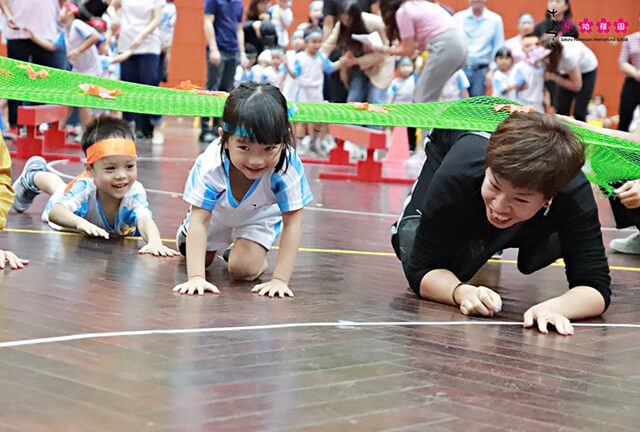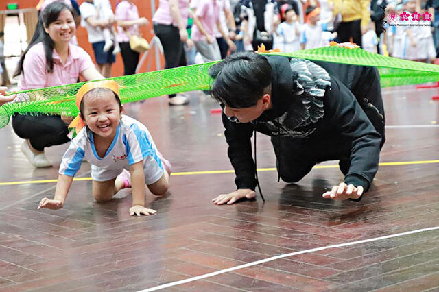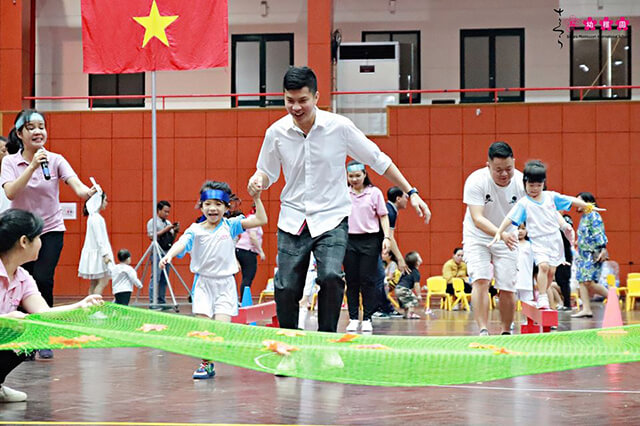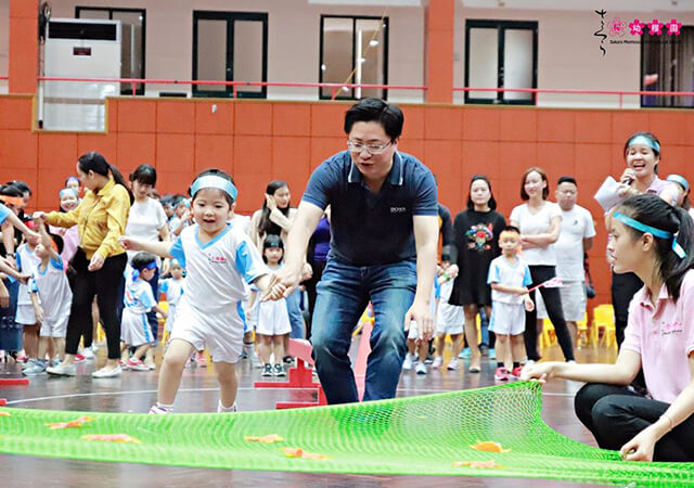 Những trò chơi đặc biệt dành riêng cho các ba mẹ và bé với tên gọi Exploring the jungle và Feed the monkey diễn ra trong không khí hào hứng và đầy ắp tiếng cười. Ba mẹ và các con sẽ đồng hành cùng nhau vượt qua các chướng ngại vật để lấy cờ và những trái chuối về đích. Đôi khi, một chút mắc chướng ngại vật tấm lưới, ba con mình lại chậm chân lấy cờ; đôi khi là những cái nhấc bổng con lên để di chuyển thật nhanh về đích… và cả những tiếng reo hò động viên nhau cùng cố gắng, những cái đập tay, những gương mặt rạng rỡ ăn mừng chiến thắng… Có lẽ, những khoảnh khắc đó đã góp phần làm nên ký ức tuổi thơ tươi đẹp dưới mái trường Sakura Montessori Thụy Khuê thân thương.