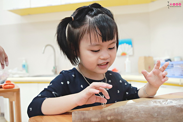 Nào bột bánh trắng tinh, nào nhân đậu xanh thơm lừng, bà ngoại Minh Khang đã tự tay chuẩn bị các nguyên liệu và từng bước hướng dẫn các con nặn bánh, cho bột vào khuôn để tạo hình những chiếc bánh dẻo xinh xắn nữa đó. Kết thúc giờ học, bạn nào cũng vui mừng khi cầm trên tay và thưởng thức những chiếc bánh dẻo của riêng mình ba mẹ ạ!