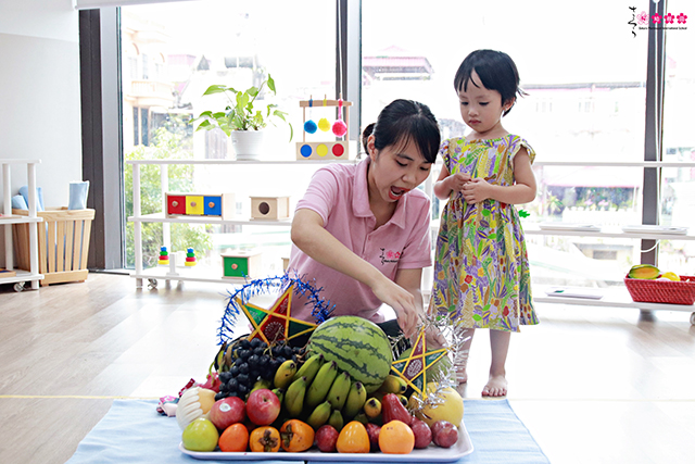Bài học về mâm ngũ quả tại lớp Cosmos cũng khơi gợi sự hứng thú của các con đó ba mẹ ạ! Đây là lần đầu tiên các con được làm quen với mâm ngũ quả với rất nhiều loại quả đặc trưng của mùa thu như bưởi, hồng, chuối, táo… nên bạn nào cũng hào hứng tìm hiểu, chú ý lắng nghe.