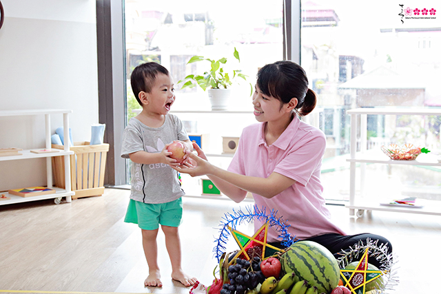 Cô rất vui khi thấy con tự cầm nắm và cảm nhận các loại trái cây bằng tất cả giác quan. Các con đã có thể tự mình nhận ra những điều vô cùng bất ngờ như: Quả dưa hấu thì rất nặng này, quả cam có màu cam hệt như tên gọi của nó, quả hồng đầu mùa có vị hơi chát…