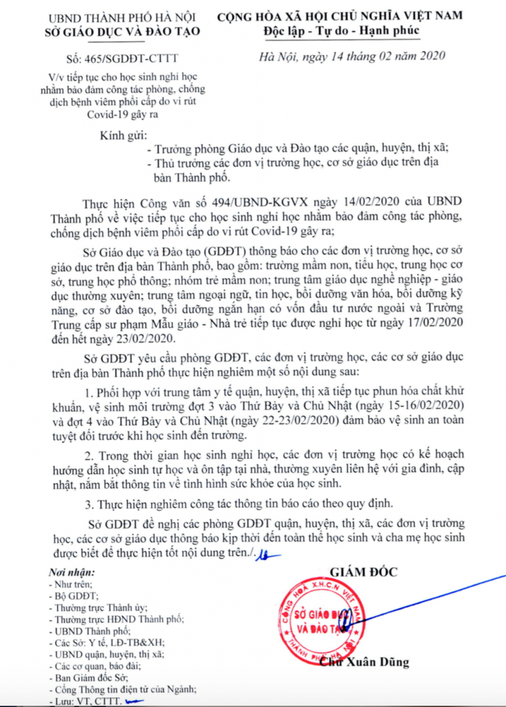 Hiện nay, tình hình diễn biến dịch bệnh viêm đường hô hấp cấp do chủng mới của virus Corona (Covid-19) gây ra vẫn đang diễn biến phức tạp. Thực hiện theo chỉ đạo của UBND thành phố Hà Nội tại Công văn số 494/UBND-KGVX ngày 14/02/2020 về việc tiếp tục cho Học sinh, Sinh viên tạm thời nghỉ học đến hết ngày 23/02/2020 nhằm bảo đảm công tác phòng, chống dịch bệnh, Nhà trường xin thông báo: Học sinh toàn trường tiếp tục nghỉ học tuần 17/02-23/02/2020.