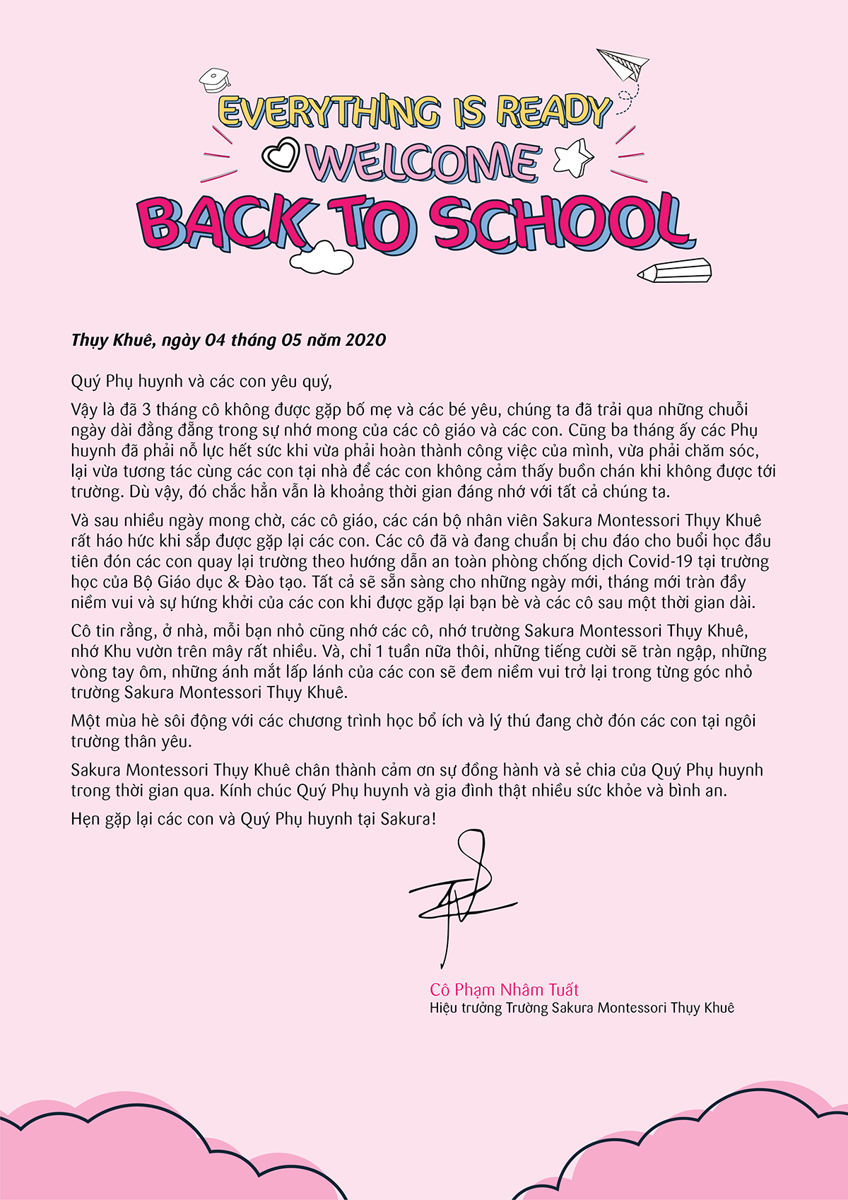 Cô tin rằng, ở nhà, mỗi bạn nhỏ cũng nhớ các cô, nhớ trường Sakura Montessori Thụy Khuê, nhớ Khu vườn trên mây rất nhiều. Và, chỉ 1 tuần nữa thôi, những tiếng cười sẽ tràn ngập, những vòng tay ôm, những ánh mắt lấp lánh của các con sẽ đem niềm vui trở lại trong từng góc nhỏ trường Sakura Montessori Thụy Khuê.