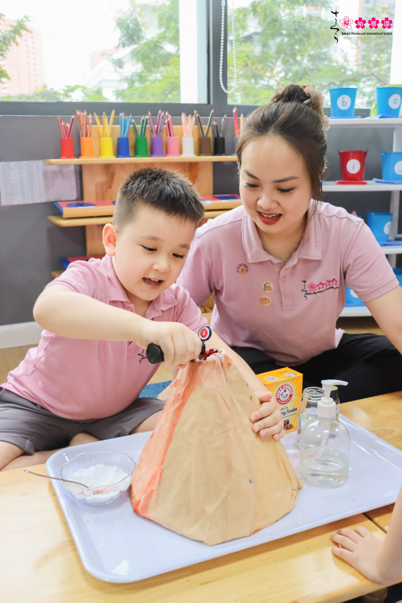 Giấm, baking soda, một chút màu thực phẩm… và rồi bùm! – Một “núi lửa mini” bất ngờ phun trào trong lớp học, mang theo tiếng “Wow!” đầy phấn khích của các bạn nhỏ. Sự phấn khích ấy không chỉ đến từ điều kỳ diệu đã xảy ra mà còn bởi chính trẻ là người đã tạo ra sự kỳ diệu ấy.