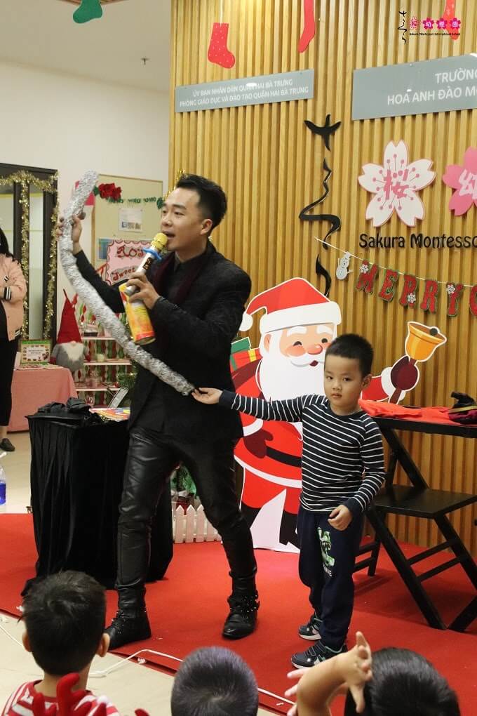 Đặc biệt, điều thú vị mà Sakura Montessori muốn dành tặng cho các con khi đến với chương trình “Nhà hàng Giáng sinh” chính là những tiết mục ảo thuật đặc sắc, những màn thổi bong bóng nghệ thuật đặc biệt đến từ những nghệ sĩ xiếc – ảo thuật chuyên nghiệp. Sau khi xem xong các tiết mục, nhiều bạn nhỏ còn lưu luyến muốn thử chạm tay vào những bong bóng rực rỡ đầy sắc màu nữa.