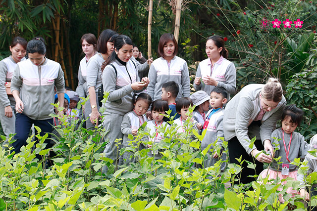 Sau đó, các bạn nhỏ cùng nhau tới vườn dâu – thức ăn chính của sâu tằm. Không chỉ có vậy, các bạn còn được tự tay cho những chú sâu tằm ăn lá dâu. Chắc các chú sâu thích lắm vì các cô đã hướng dẫn các bạn nhỏ lựa những chiếc lá xanh non mơn mởn.