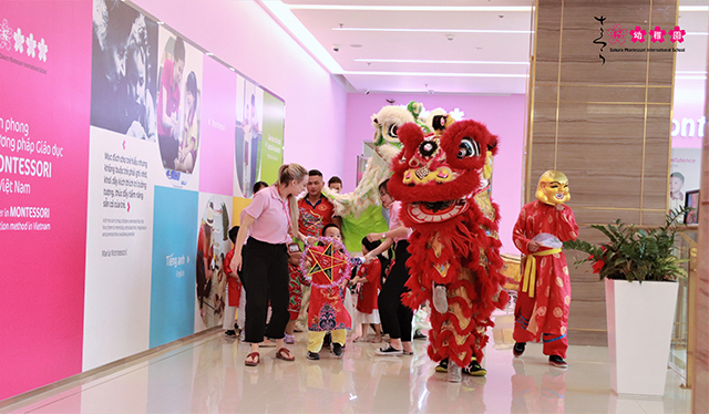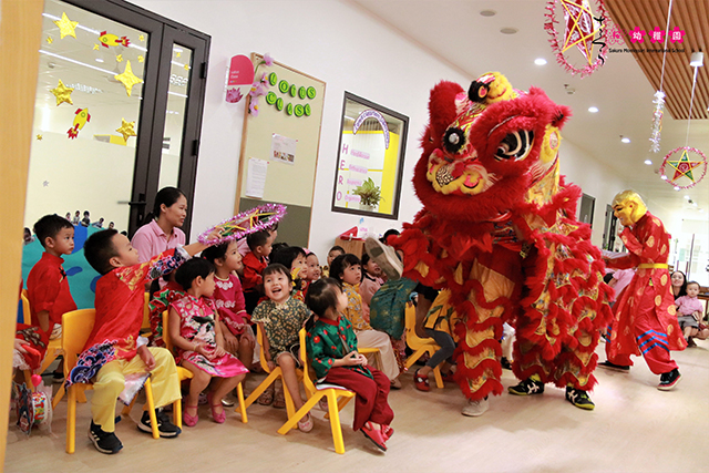 Kết thúc sự kiện các con được xem biểu diễn múa lân rồng và rước đèn. Nếu các bạn nhỏ nhỏ còn chút lạ lẫm, sợ hãi thì anh chị lớn lại lấy làm thú vị khi được xem biểu diễn. Cùng với tiếng trống múa lân rộn ràng, các con dắt tay nhau, cùng rước đèn và hát vang bài hát bài “Chiếc đèn ông sao”. Nhìn những nụ cười của các con, các cô hiểu chúng mình đã cùng nhau làm nên một Tết Trung thu đầu tiên thật ý nghĩa. Sakura Hai Bà Trưng rất vui vì có thể góp phần gìn giữ, vun đắp cho các con những khoảnh khắc tuổi thơ thật đẹp và ý nghĩa.
